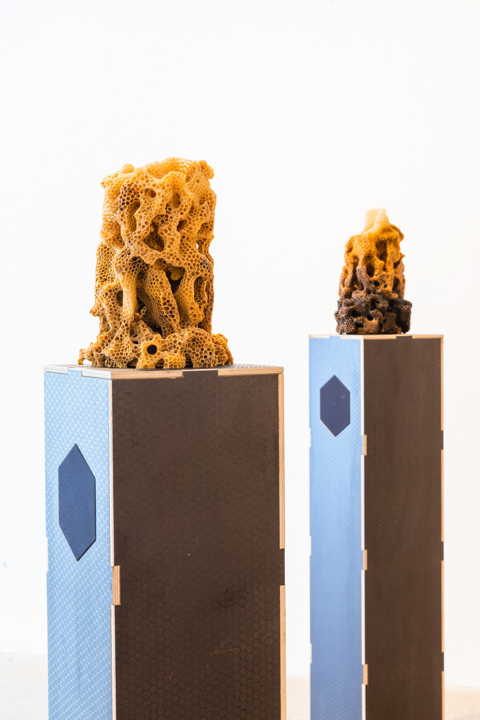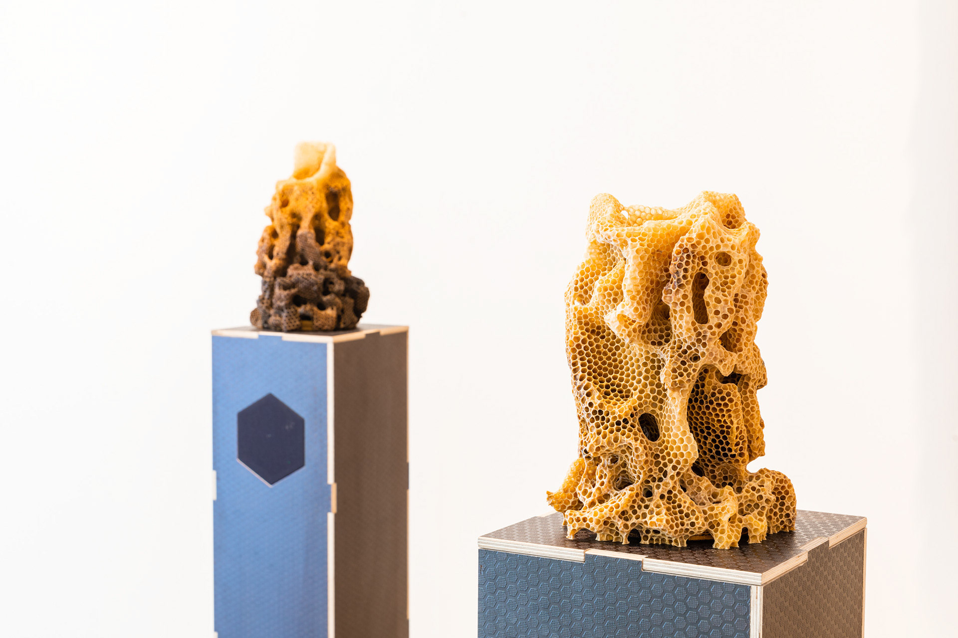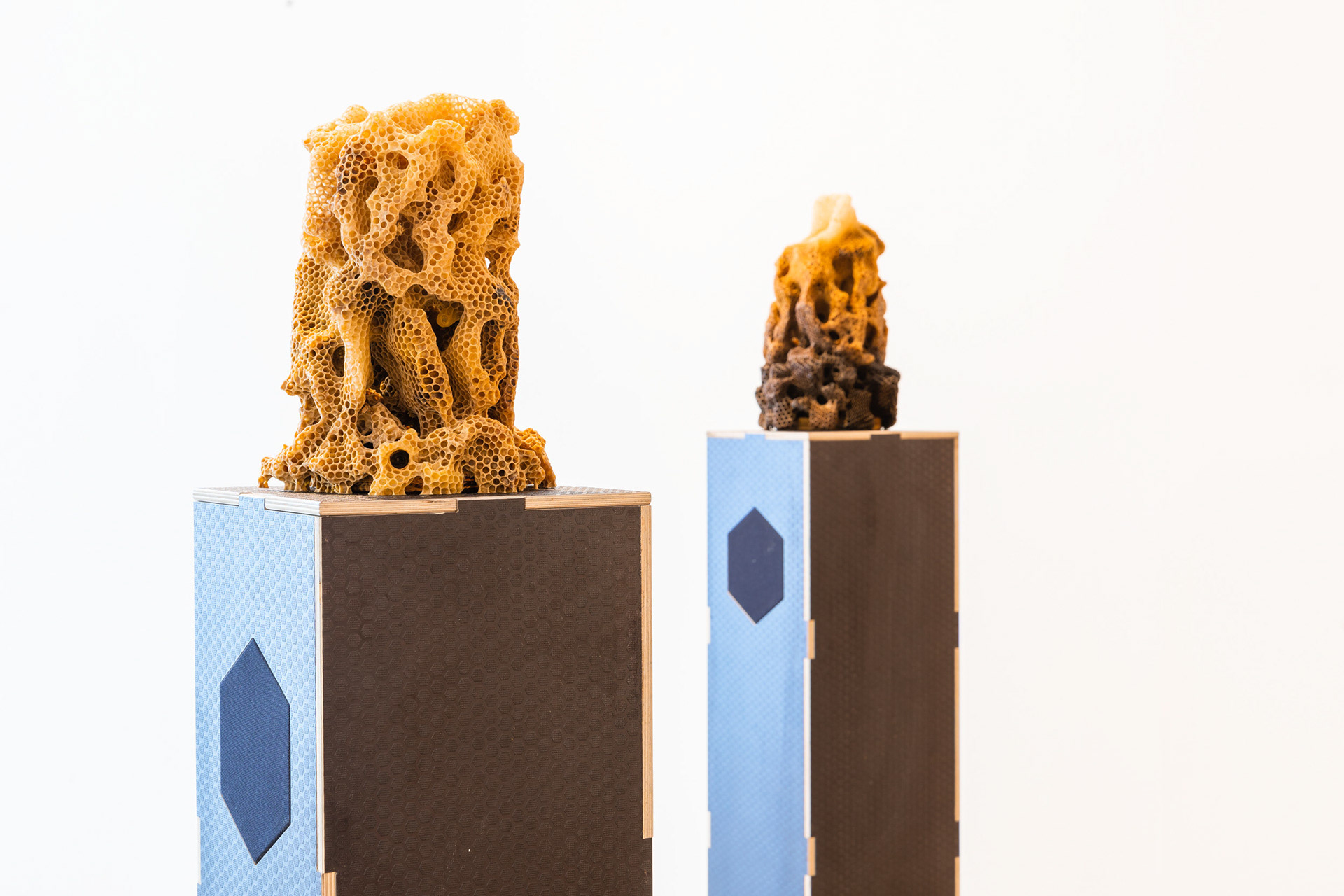 Ritual Collaboration. [Exhibition: Natural beeswax, hexagonal plywood plinths, 1050 x 350 x 350mm]. Wreckers Artspace, Woolloongabba, QLD. Made in collaboration with European honeybees. Image: Charlie Hillhouse
