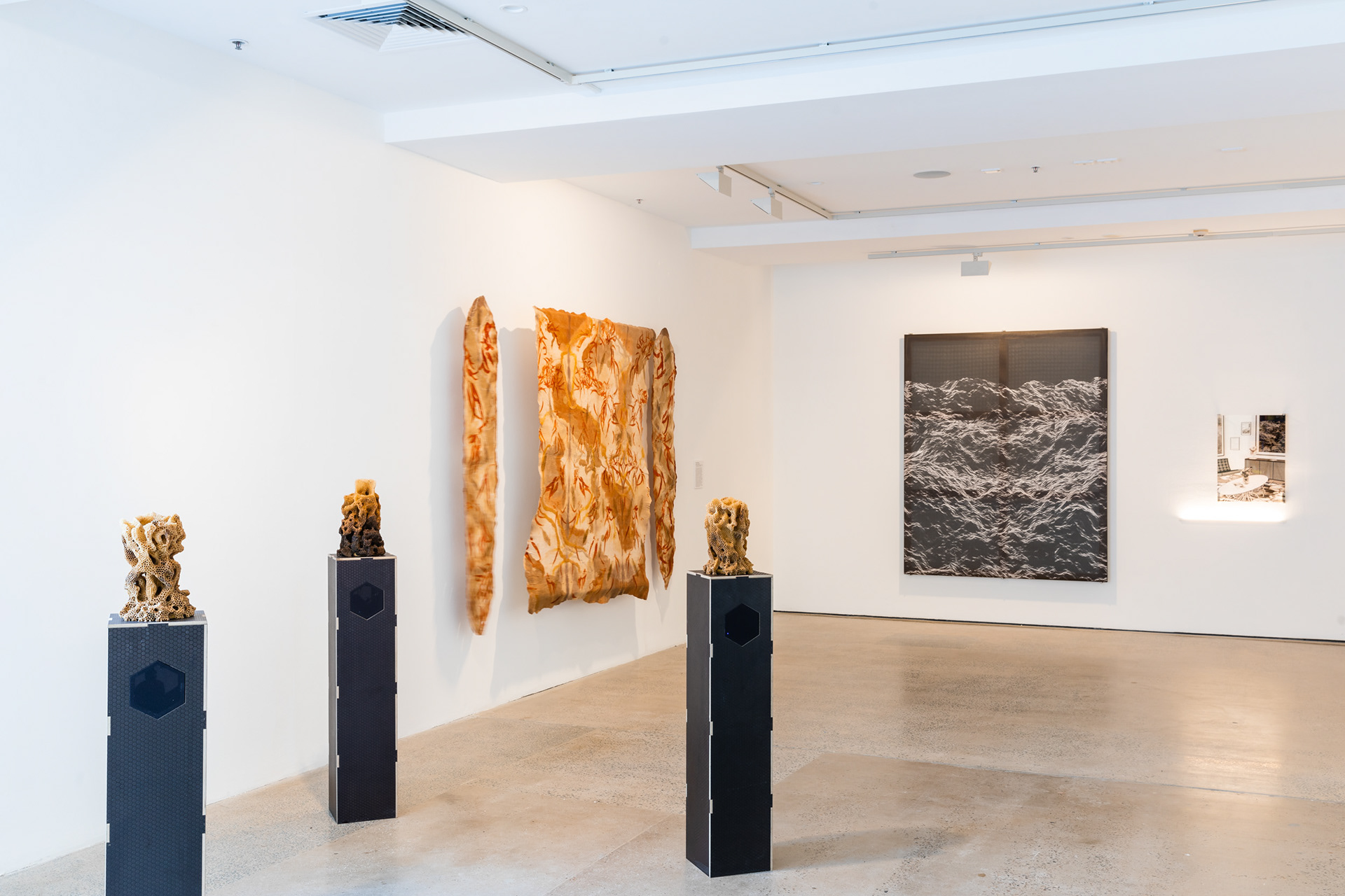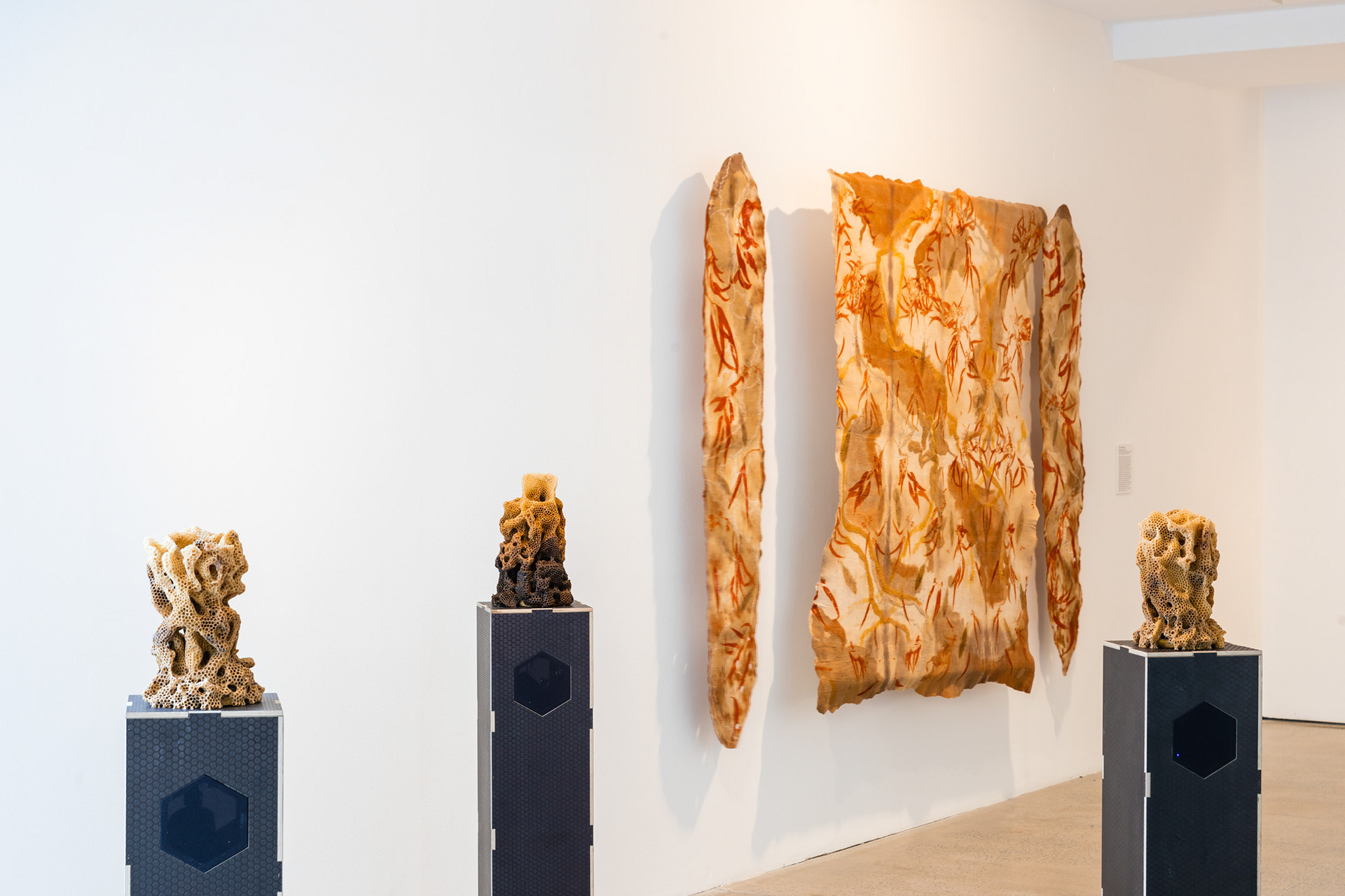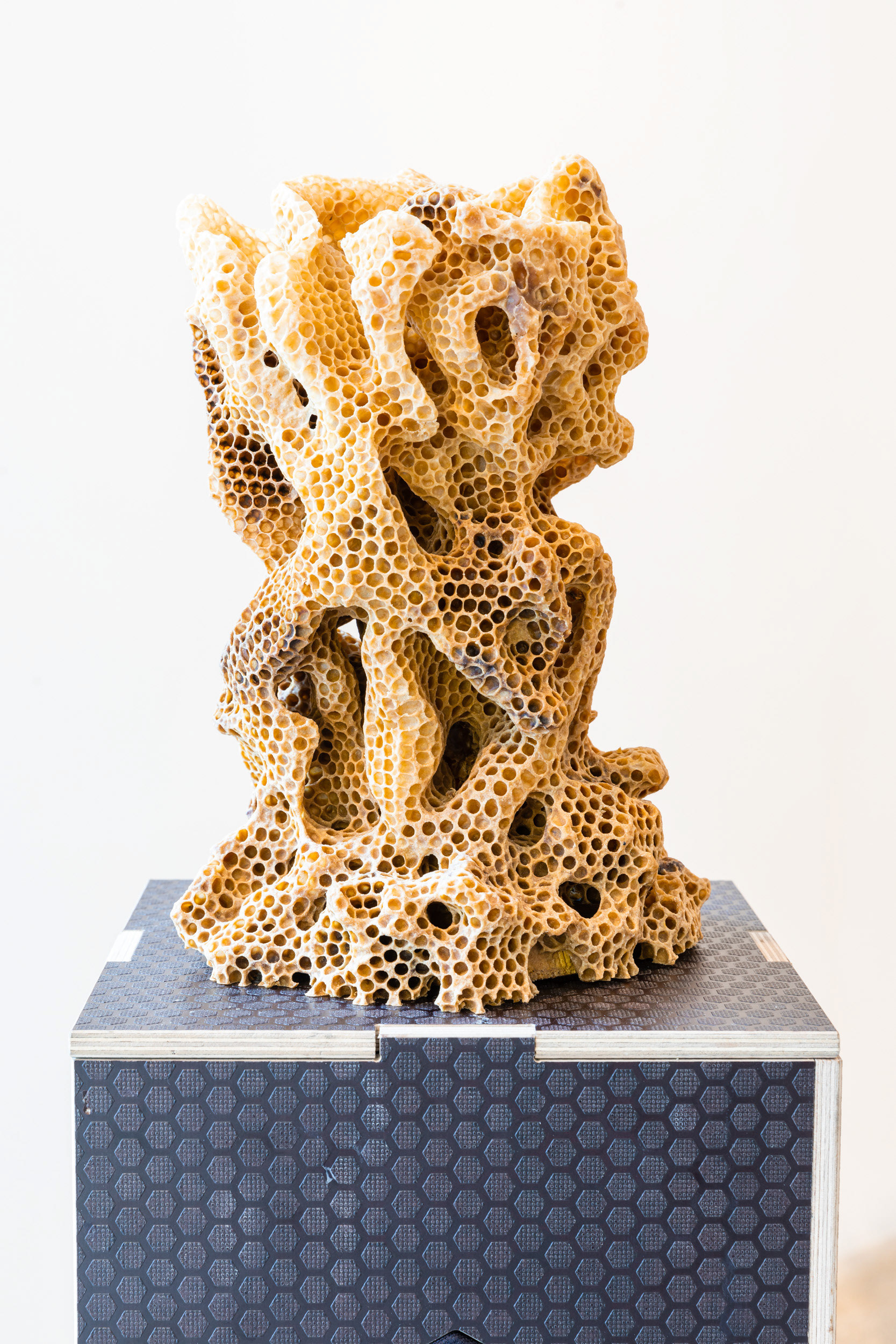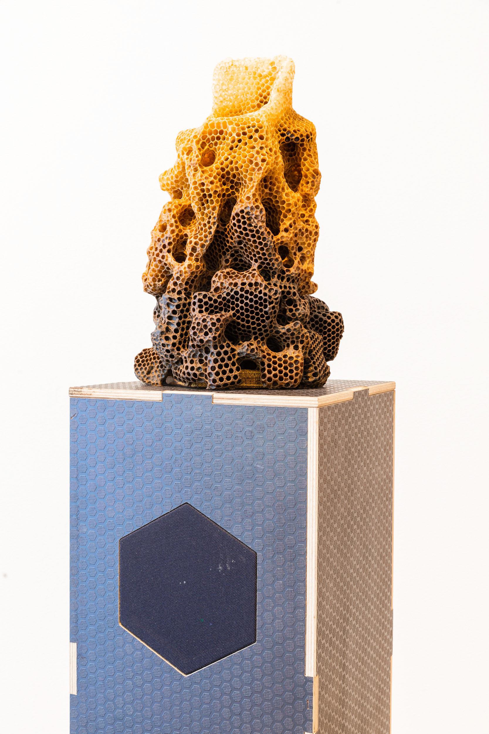Ritual Collaboration. [Exhibition: Natural beeswax, hexagonal plywood plinths, 1050 x 350 x 350mm]. Wreckers Artspace, Woolloongabba, QLD. Made in collaboration with European honeybees. Image: Charlie Hillhouse